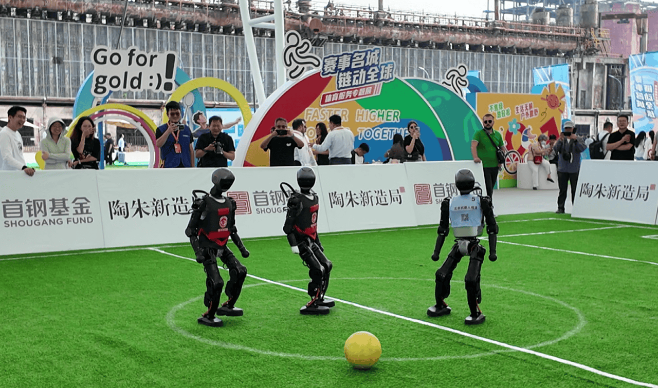 在机器人足球运动展区,6个机器人在绿茵草地上展开了火热的竞技大比拼。来自北京信息科技大学的裴瑞霖向记者表示:“我们此次受邀参展,带了它们过来进行3v3的AI自主足球赛。在科技方面,我们主要用到视觉识别功能,机器人可以通过识别场地上的标志物来实现自己的定位并进行各种决策,从而实现纯AI自主运行。”
