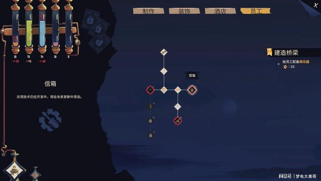 科技树有着丰富的可研究升级科技,分为制作、装饰、酒店和员工四大类,随着研究升级你会解锁更多的工作,例如种植、冶炼以及建筑游戏室扩大房间建造面子等等各种要素,当然还有员工雇佣,游戏右上角有图鉴,在图鉴中可以查看各种信息包括教程收藏等等,可以随时回顾并且查看线索世界观等等。