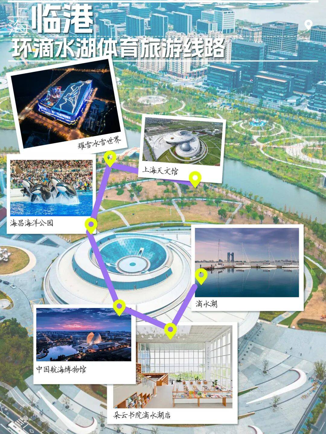 围绕滴水湖长达8公里的环湖路堪称“魔都最美健身步道”。周边涵盖滴水湖、耀雪冰雪世界、海昌海洋公园、上海天文馆、中国航海博物馆、朵云书院·滴水湖店,有着集运动、休闲、文化、娱乐于一体的综合性体验。滴水湖如一颗巨大的“蓝色眼泪”,静静镶嵌于东海之滨,帆船、帆板等无动力水上运动可以在这里开展;拥有全球最大室内滑雪场的耀雪冰雪世界,有着4000立方米真雪,让冰雪运动的魅力在这里释放。