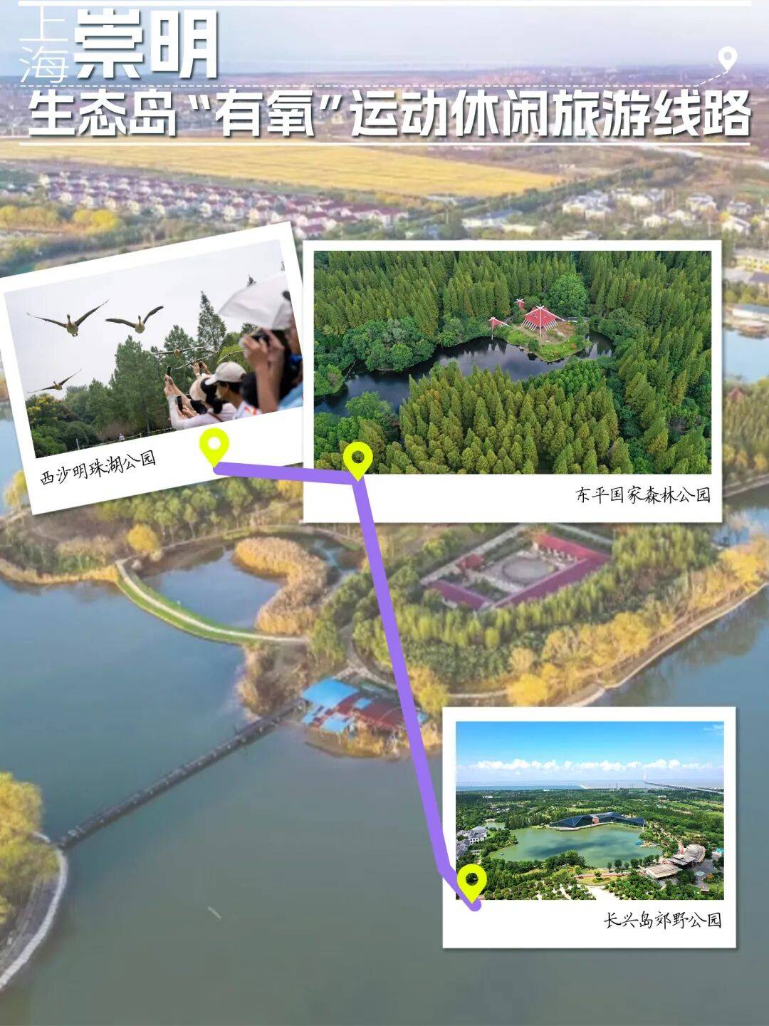 长兴岛郊野公园、西沙明珠湖公园、东平国家森林公园三点串联成崇明“有氧”体验游路线。以运动亲近自然为主题,充分发挥崇明生态资源优势,融入水上项目、营地运动、马术、攀岩等体育竞技体验项目。或体验平台舟、独木舟、电动船等各类时尚、好玩的水上项目,浅尝一丝丝刺激;或漫步栈道,静静感受自然的馈赠与岁月静好;或在茂密的森林之间与马匹来一场亲密接触,做一日优雅的“骑士”;或于当生态风光处跳一舞峭壁芭蕾,将身体的协调性、平衡感和柔韧性调动到最佳……
