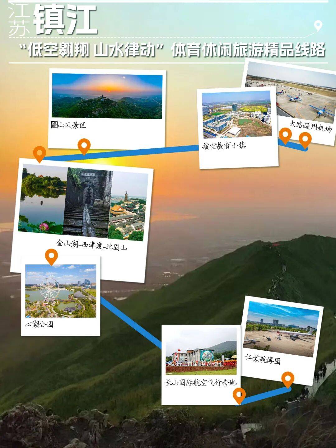 线公里。位于长江之滨的圌山,因其独特的地理位置和自然风光,是当地颇受欢迎的登山地点。晨露未尽,攀至圌山山顶,看云雾拨开,太阳从地平线升起,感受大自然的光辉与生命的希望。距离圌山15分钟车程的航空教育小镇,可以一站式学习体验航空的方方面面,圆一个“飞行梦”。镇江市积极推进“低空经济”项目,如西津渡低空文旅项目,开通空中旅游线路,打造“水陆空立体文旅走廊”,可以从空中视角解锁西津古韵,感受金山湖的秀美以及“江河交汇”的壮丽风光;长山国际航空飞行营地,体验刺激滑翔伞俯瞰大地,乘浪漫热气球缓缓升空,拥抱广阔蓝天,收获难忘的空中视角;坐落于长山南麓的江苏航博园研学基地,提供航模制作、模拟飞行体验、无人机飞行表演、真机座舱实操等多项沉浸式体验。
