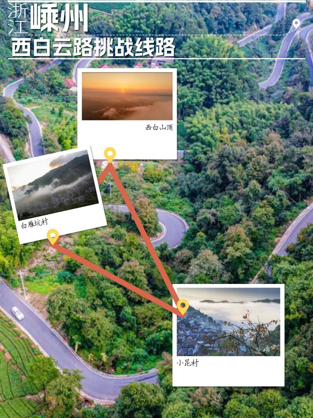 线公里。贯穿西白山核心景观带,沿途云海翻涌、茶园叠翠。有着800年历史的小昆村素有“江南小色达”之称,因天然屏障西白山隔绝了喧嚣,建筑依山而建,鳞次栉比。西白山顶(海拔1095米)年均云海日超100天,秋季可见“佛光”现象。