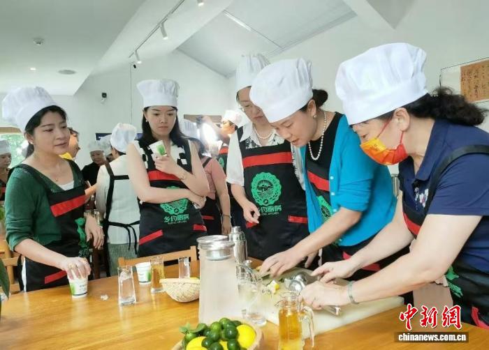 图为20多名女企业家参加“乡约厨房”活动,深度体验斑斓糕、老盐柠檬水等海南特色美食制作。 (海南省休闲农业协会 供图)